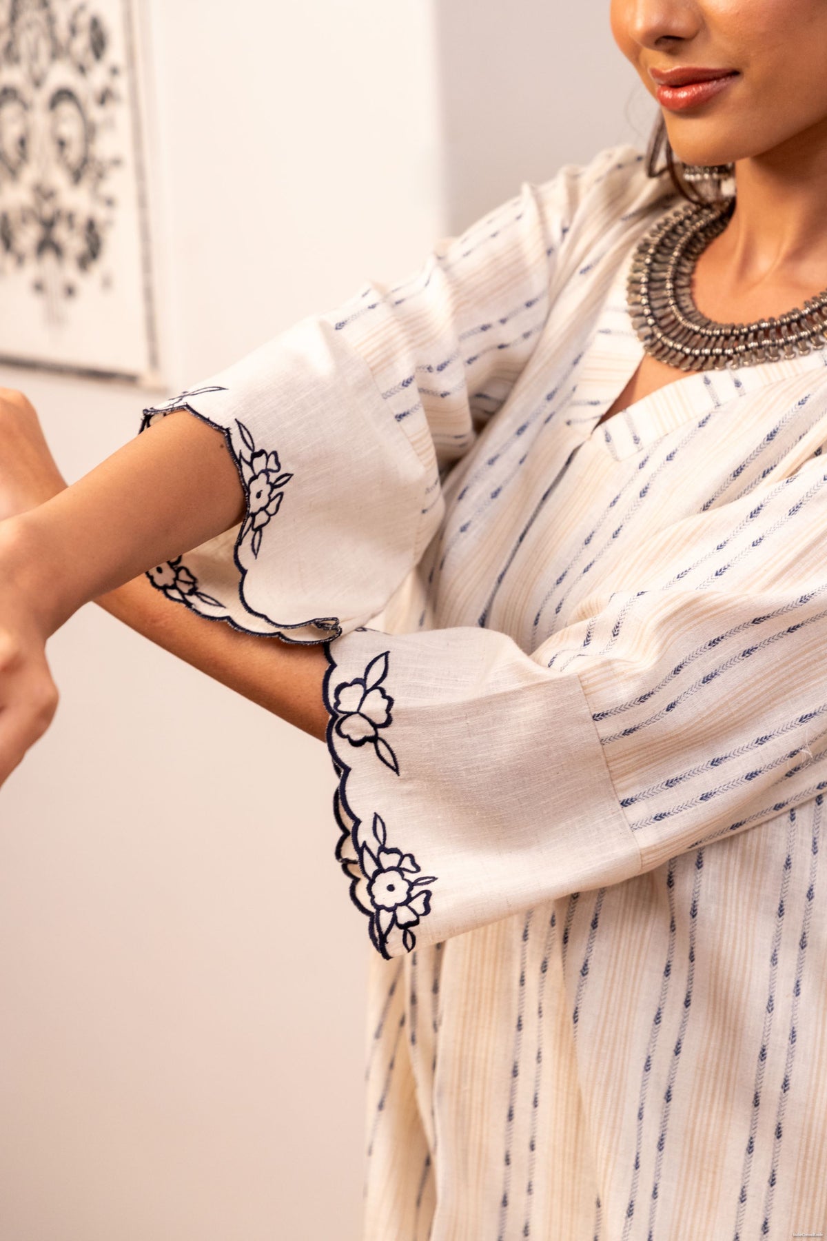 Sleeves: Three-fourths sleeves with cutwork embroidery.