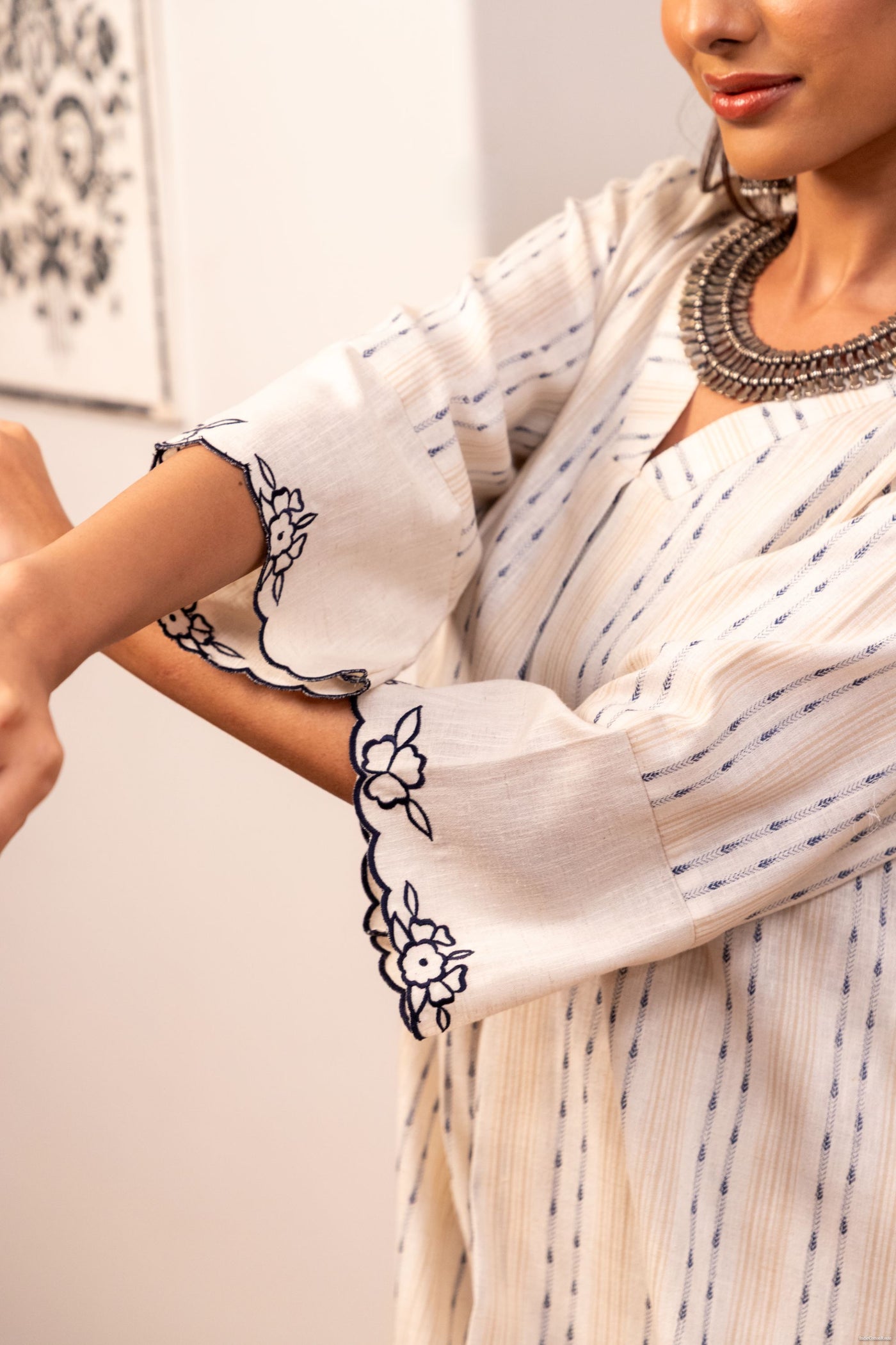 Design: Cutwork embroidery on sleeves with black thread edging.