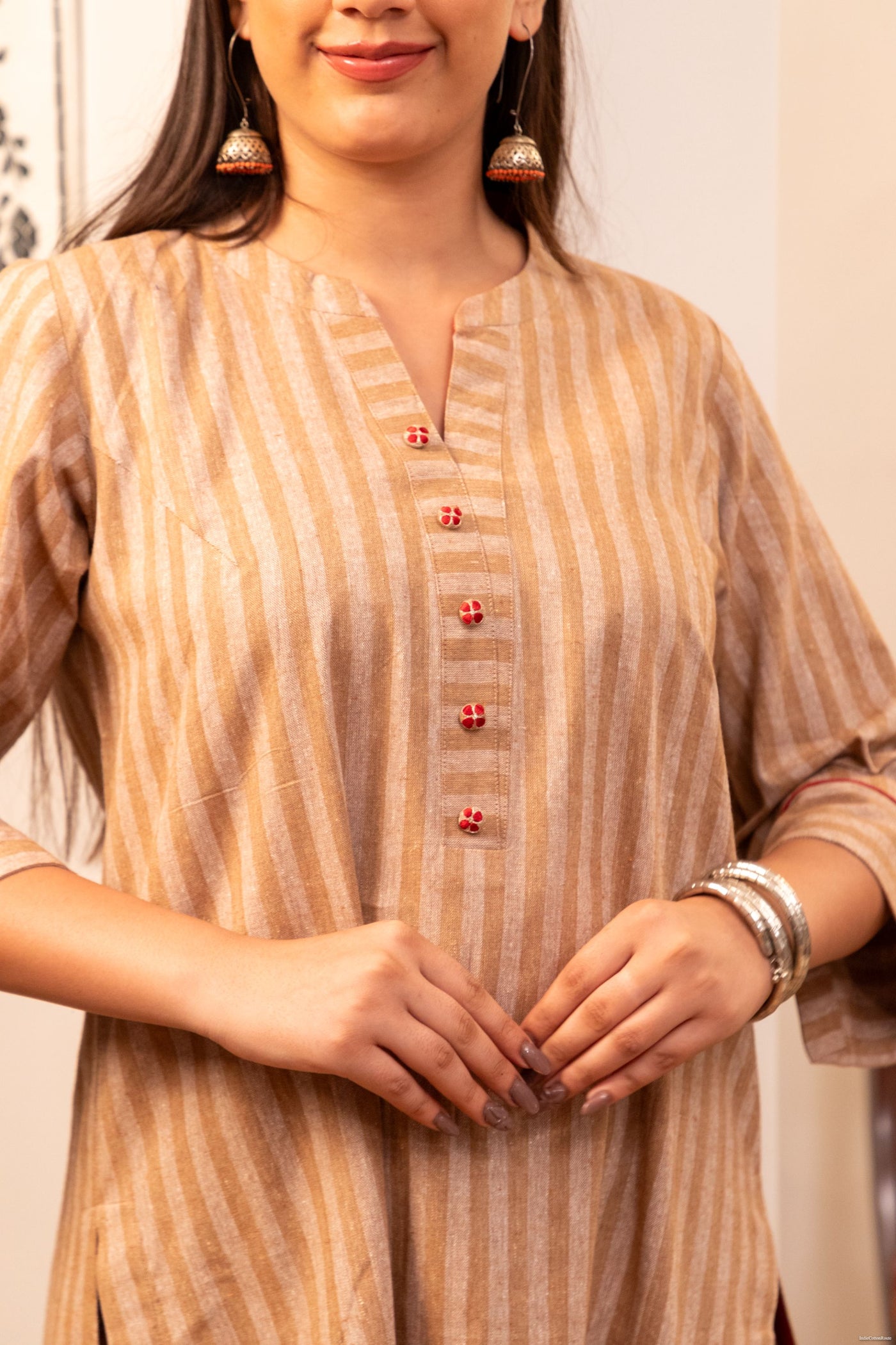 Effortlessly elegant and versatile, this sandy brown and beige striped co-ord set combines a top and pants, perfect for everyday luxury, office, vacations, and festive occasions. Red piping and embroidered button details elevate its chic appeal.