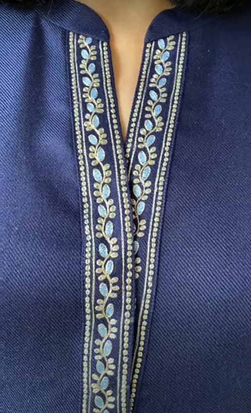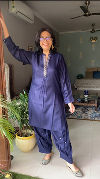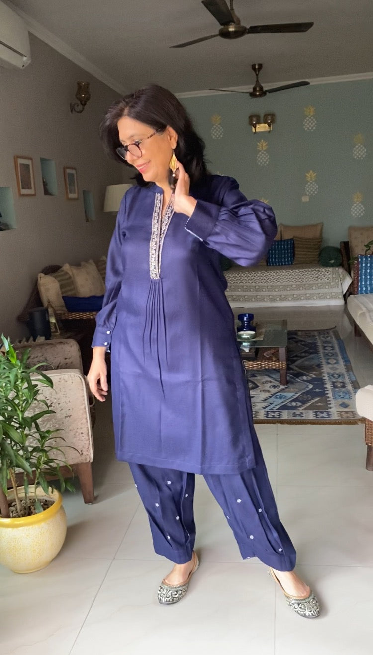 A royal blue spun co ord set with intricate Tilla n thread embroidery with pleating, contrast facing is paired with a pleated spindle pants.