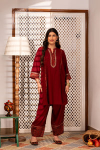 • Bold, regal, and festive — the Scarlet Ajrak Kurta Set merges hand-block-printed Ajrak panels in deep maroon-red with metallic tilla embroidery for a statement-making festive ensemble. The yoke, collar, and sleeve hems are adorned with Ajrak, while the curved pants feature Ajrak cuffs and tilla bootis, giving the set a royal and elegant fall.