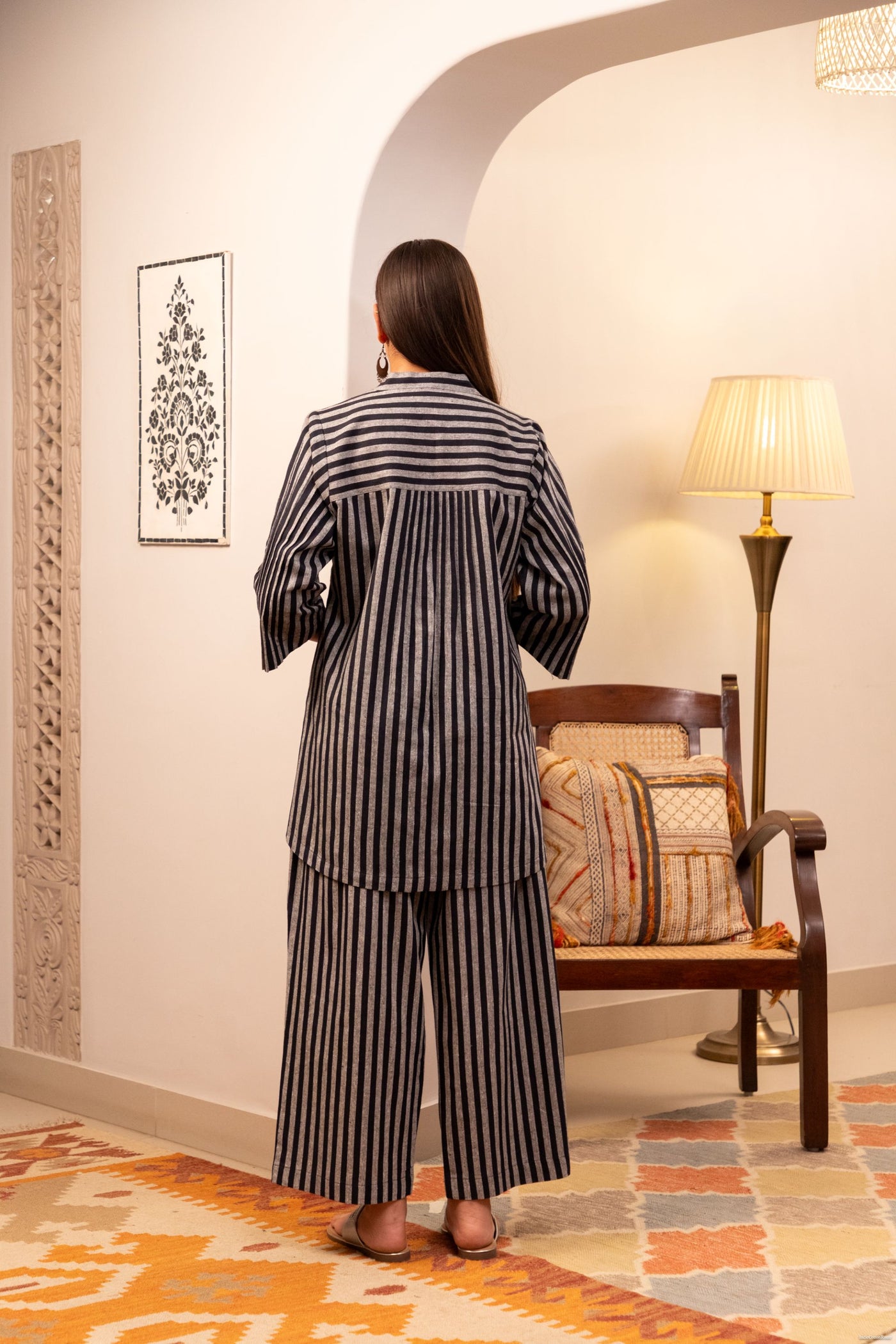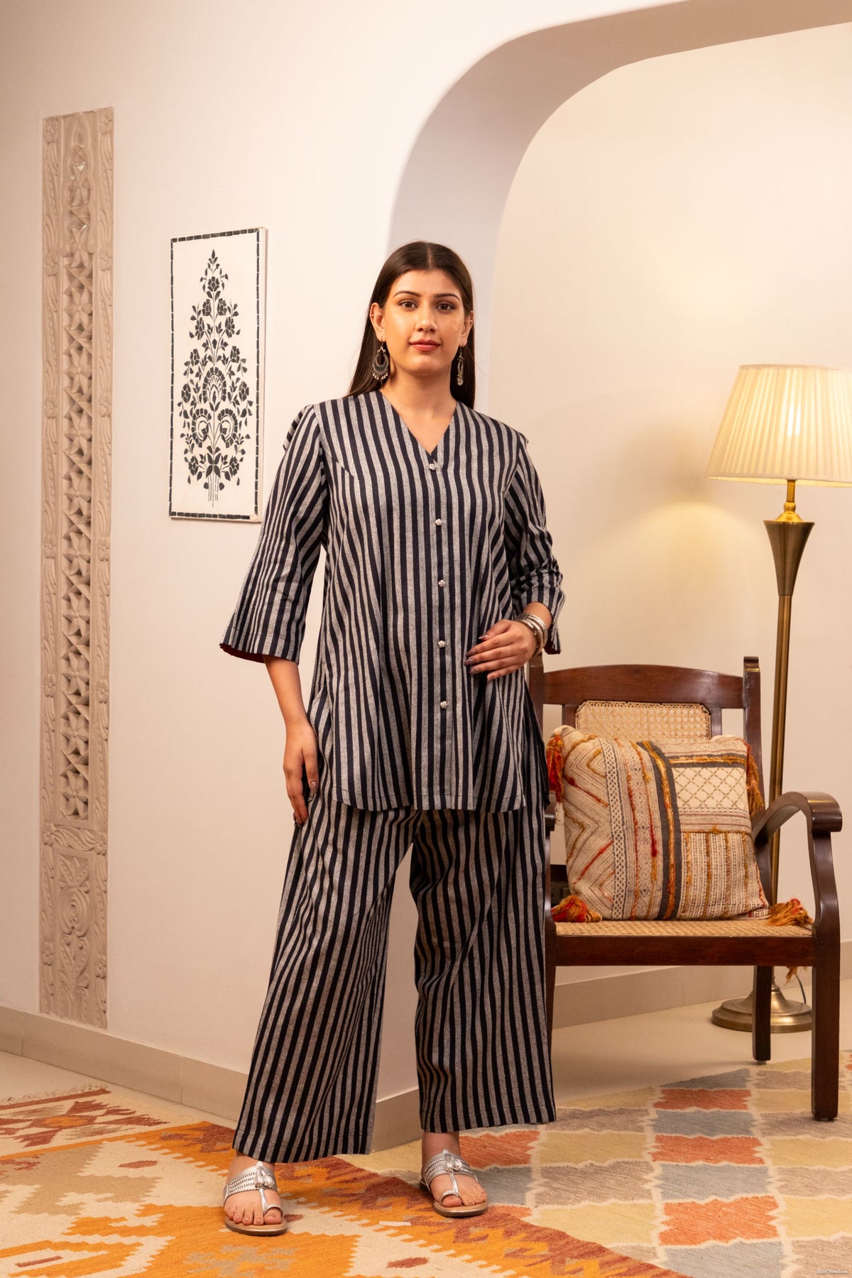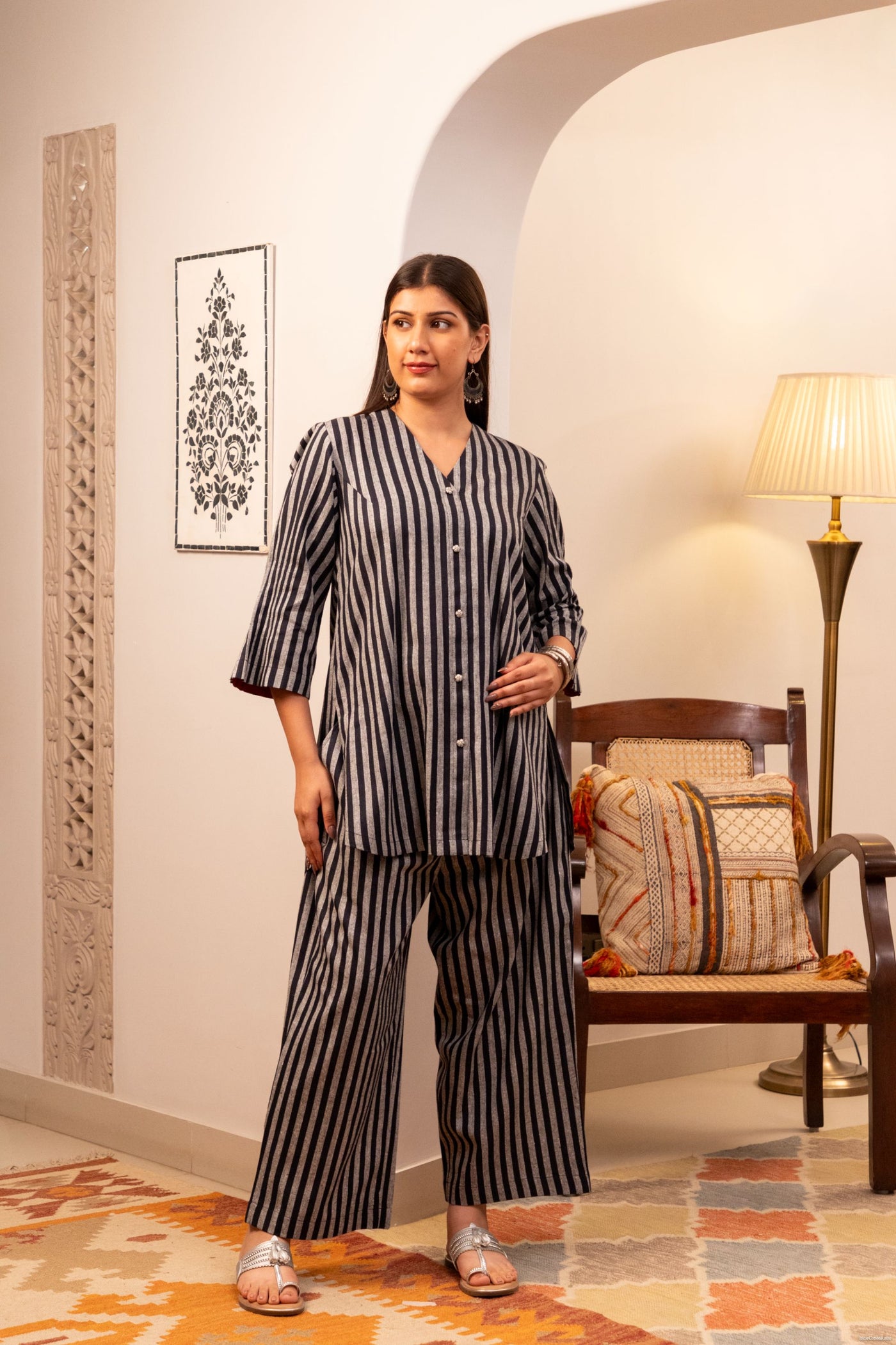 Effortlessly chic and versatile, this black-and-gray minimal striped linen-cotton co-ord set is designed to elevate your everyday wardrobe with comfort and style, perfect for work, evenings, or holiday lounging.