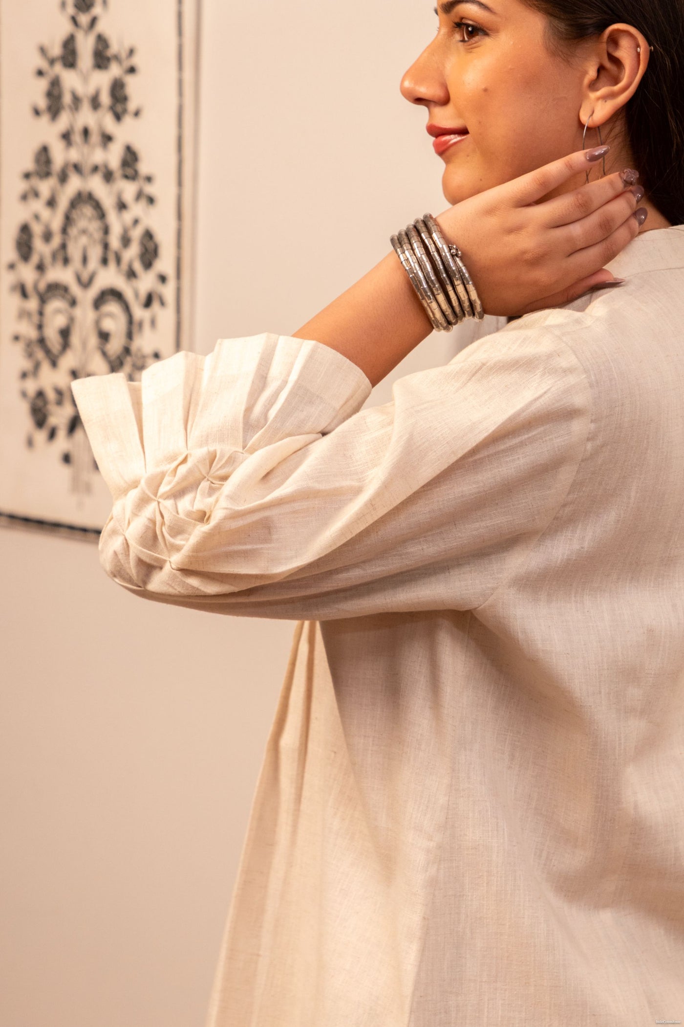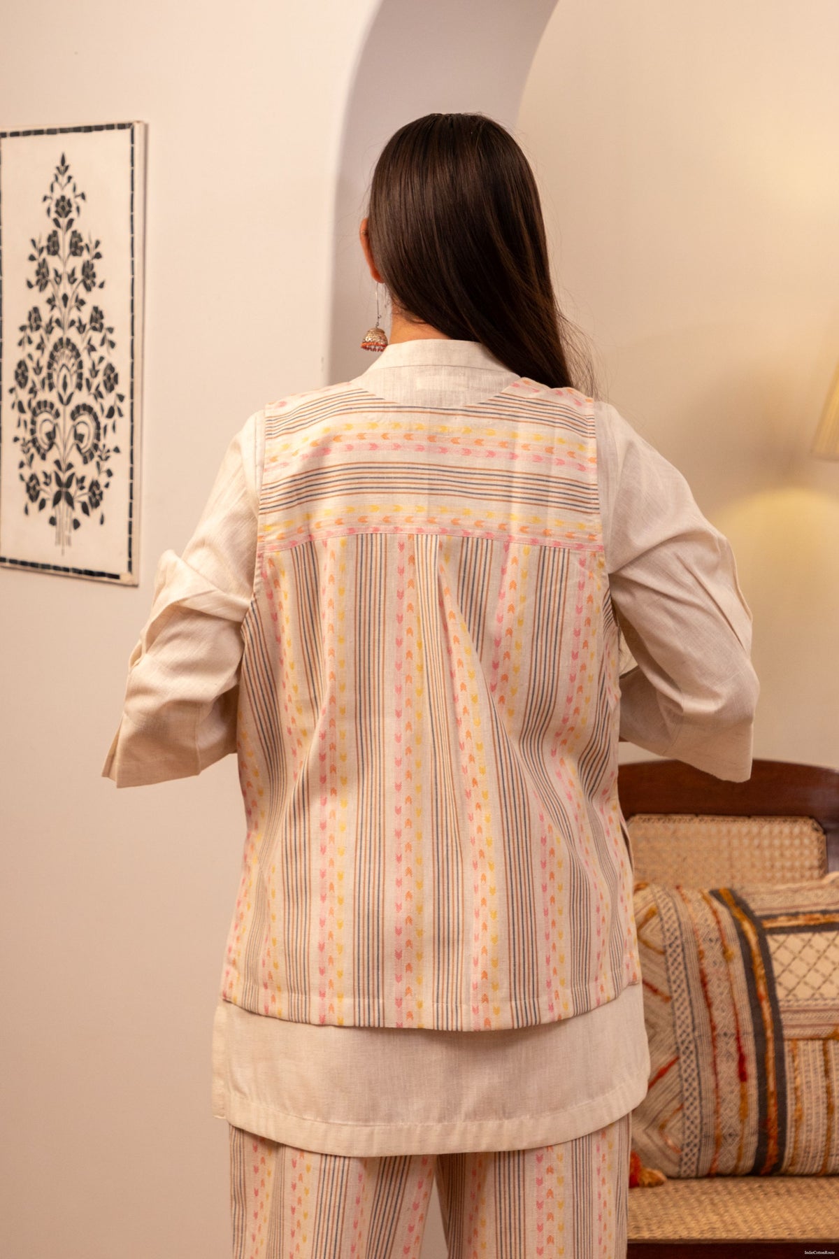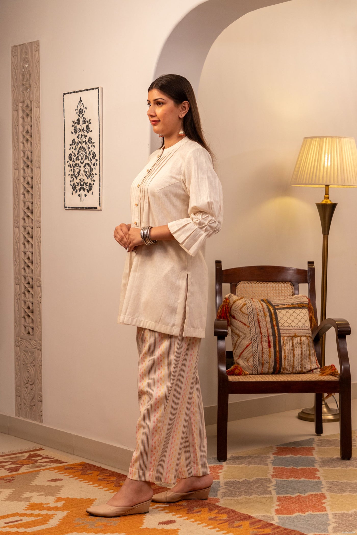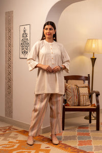 Effortlessly calming and minimalist, the Sukoon Co-ord Set is crafted in soft off-white linen-cotton fabric with unique pleating detailing on the three-fourths sleeves and yoke, giving it a serene and elegant silhouette. The kurta features subtle buttons adorned with delicate thread embroidery flowers, while the striped pants in off-white with red, yellow, and black accents create a sophisticated contrast. Perfect for everyday luxury, this set is ideal for office wear, brunches, dinner parties, or airport looks.