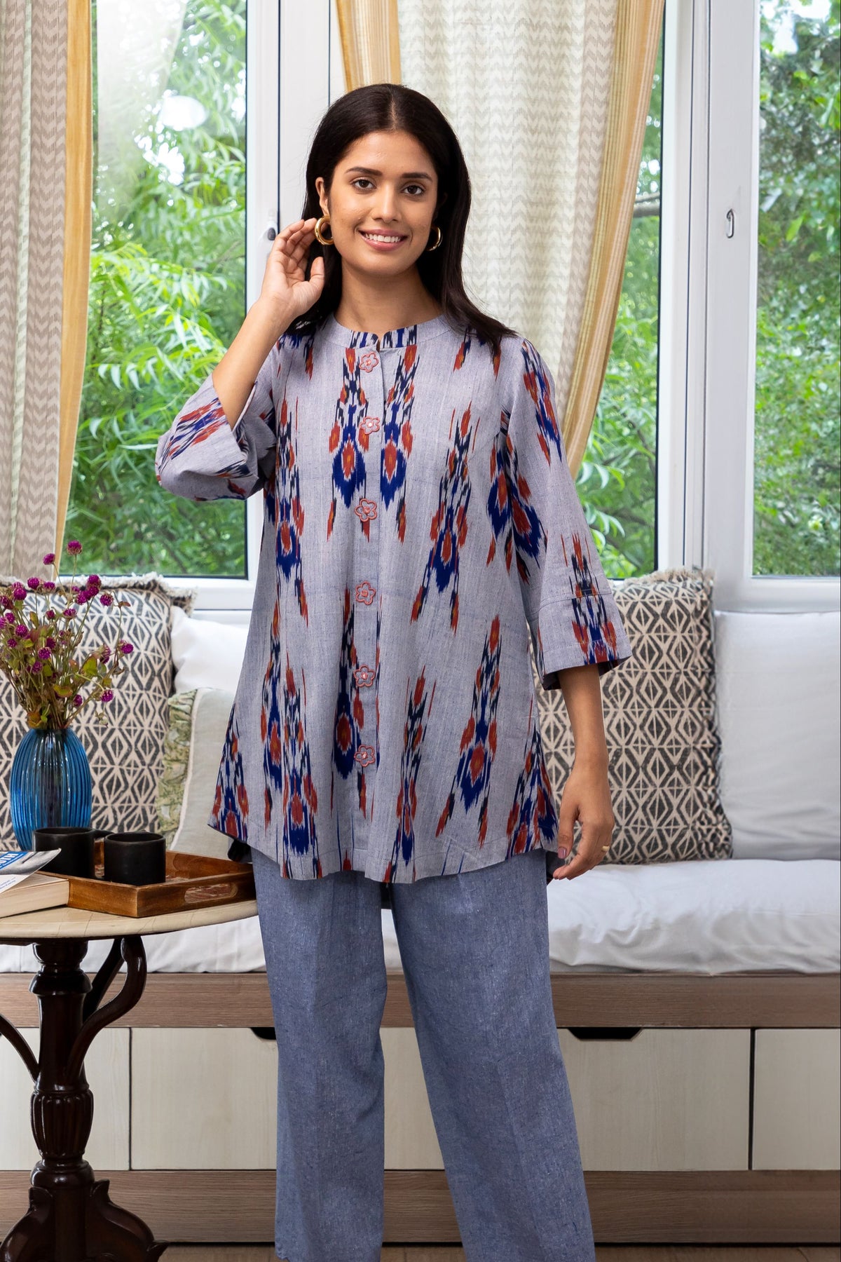 A pure cotton ikkat top with bold tribal flower motifs, blending heritage craft with modern cuts for versatile styling.