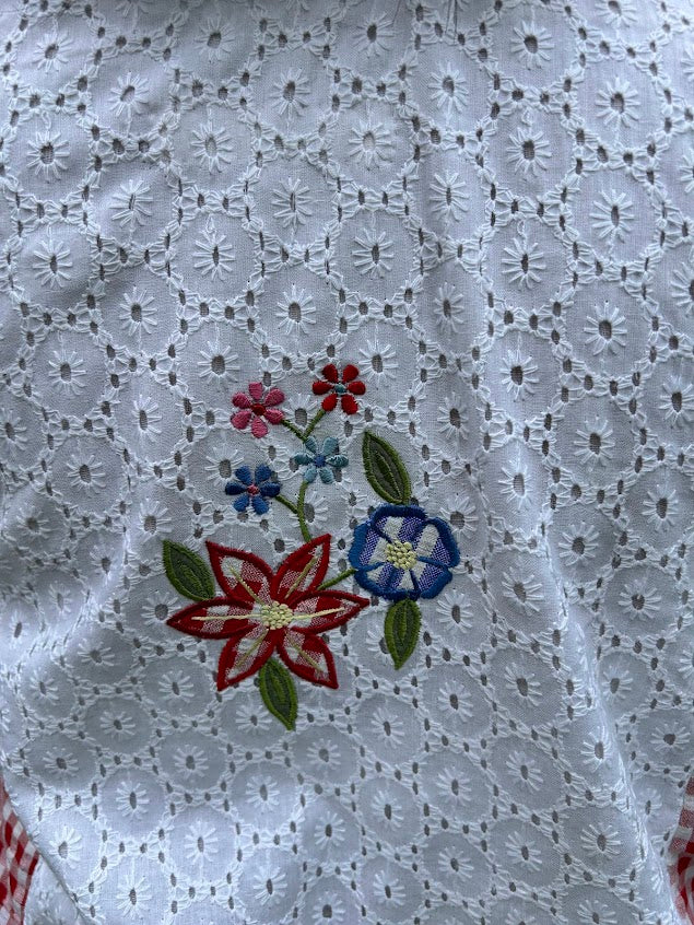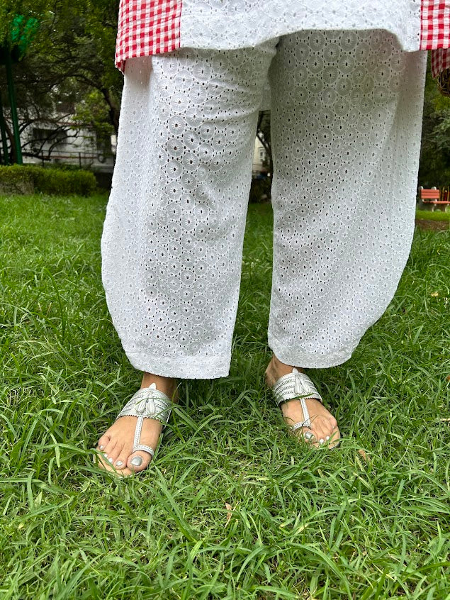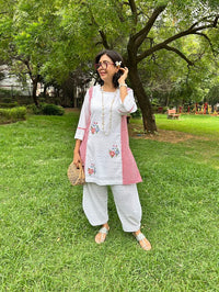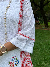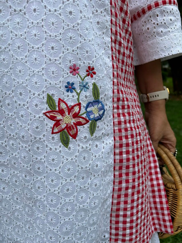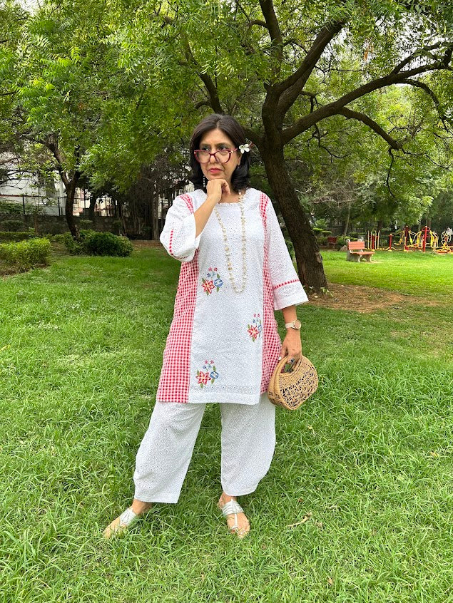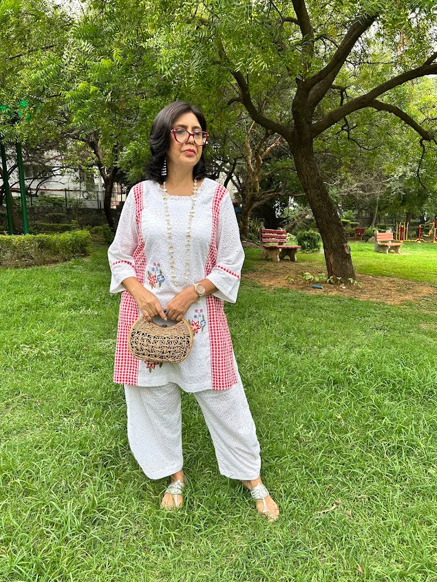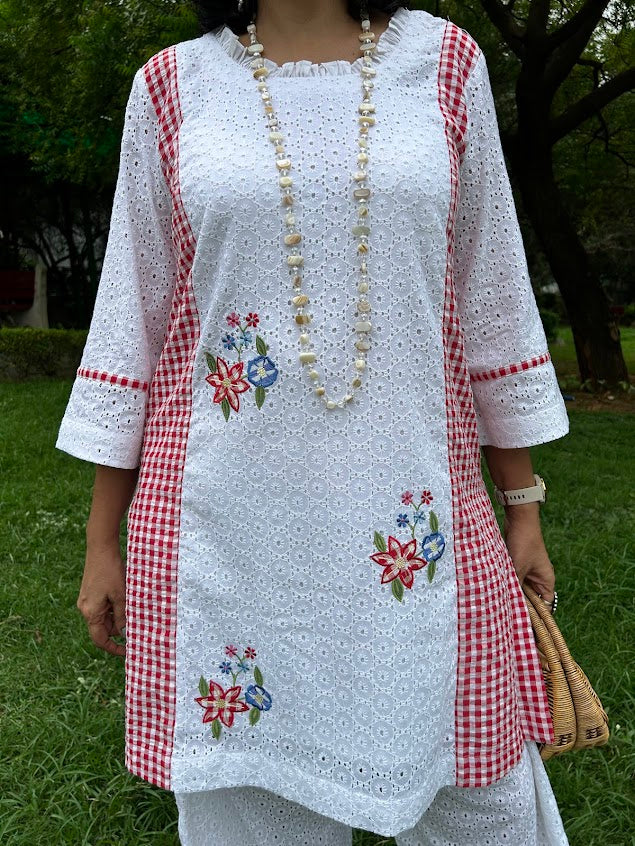 A white Hakoba co ord set with red contrasting checks side panels and edgings, has floral vibrant appliqué embroidery on the front with frill edgings on the neck is paired with white hakoba cocoon pants which make you look slim.